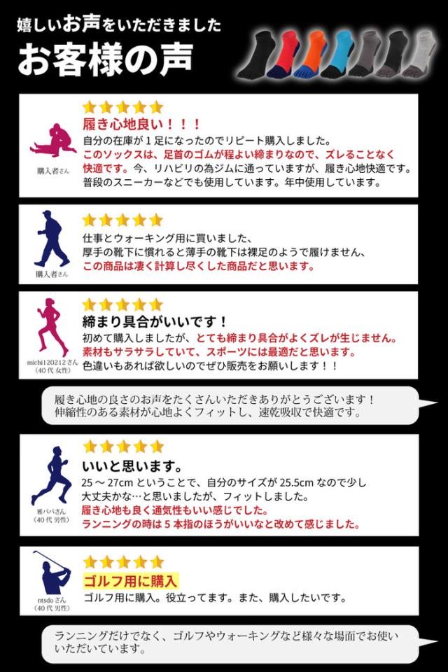 - 2/2注文、2/5到着しました。初めて五本指ソックスを購入して、履いてみました。感想は、指の間に違和感がありますが慣れれば全然問題なく履けます。スポーツに履く用なので、足首丈で生地は薄めですが、土踏まずのところをキュッとサポートしてくれるので、履き心地は良いです。良い商品を購入したと思います。耐久性はわからないので、星マイナス1です。