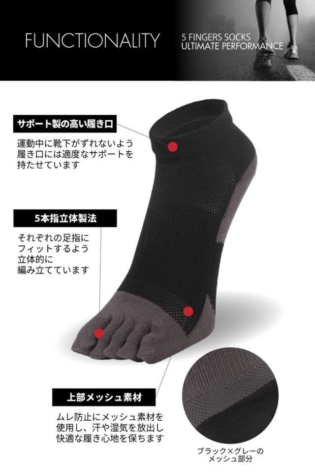 ■商品説明:スポーツ の パフォーマンス 向上に最適な 5本指 ( 五本指 ファイブフィンガー ) ソックス です。カラーは、使いやすく おしゃれ でスマート に見える かっこいい ブラック 黒 となります。