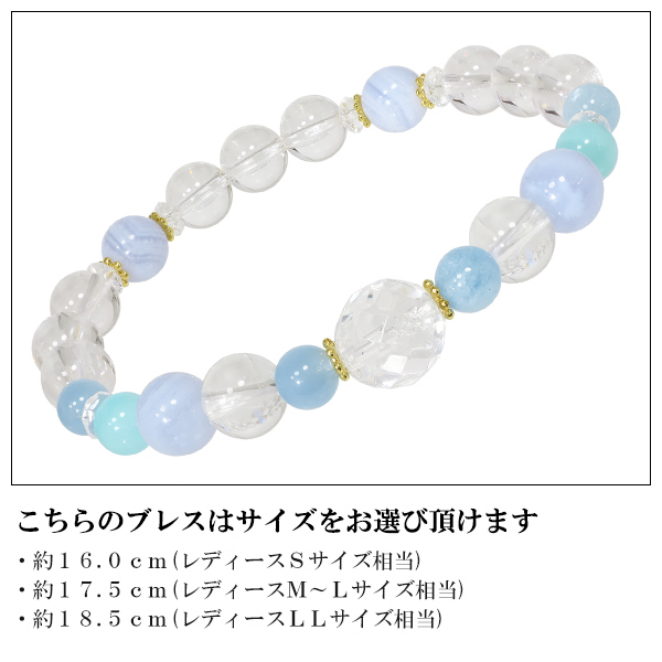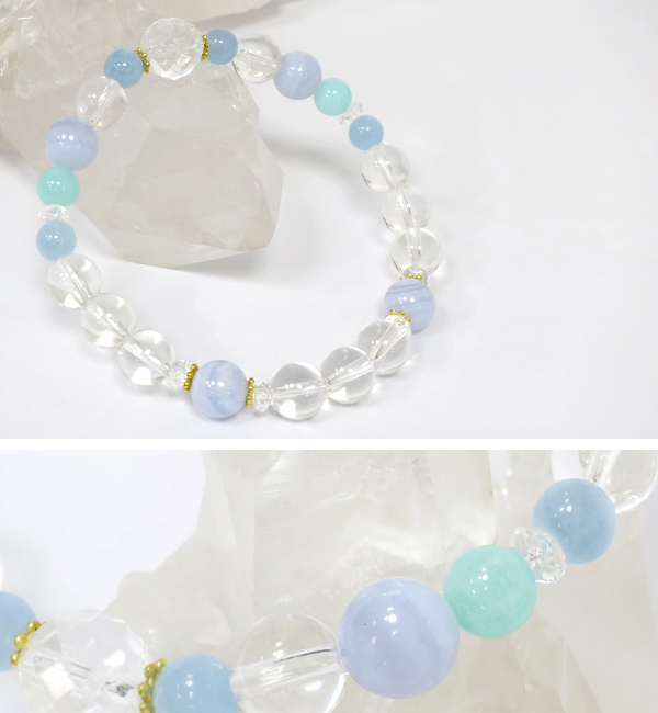 クリアな水晶で引き立てつつ、淡いブルーやミント色で爽やかにまとめました。