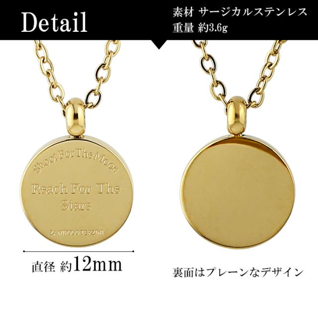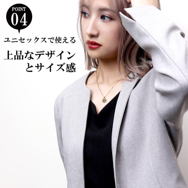 | 素材・サイズ | ・素材 サージカルステンレス ・重量 約3.6g(チェーン含む) ・コインの大きさ 直径 約1.2cm 厚み 約2mm ・チェーンの長さ 40/45cm(アジャスター付) |