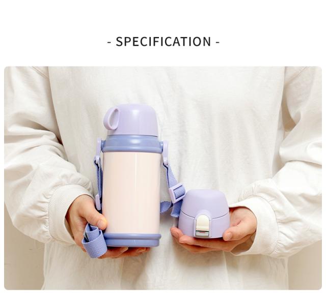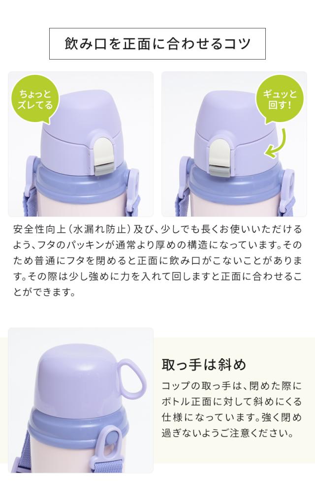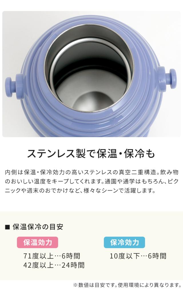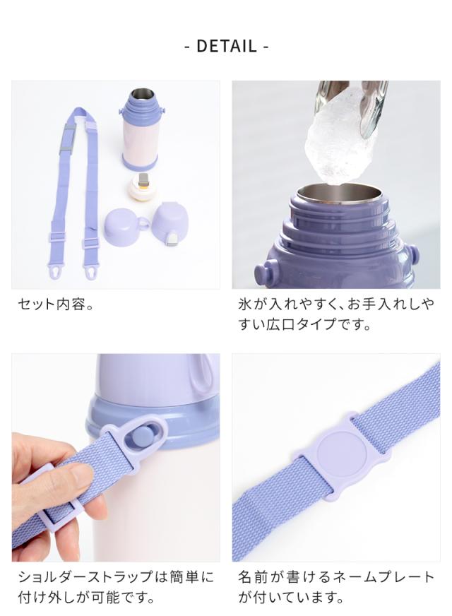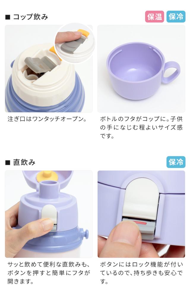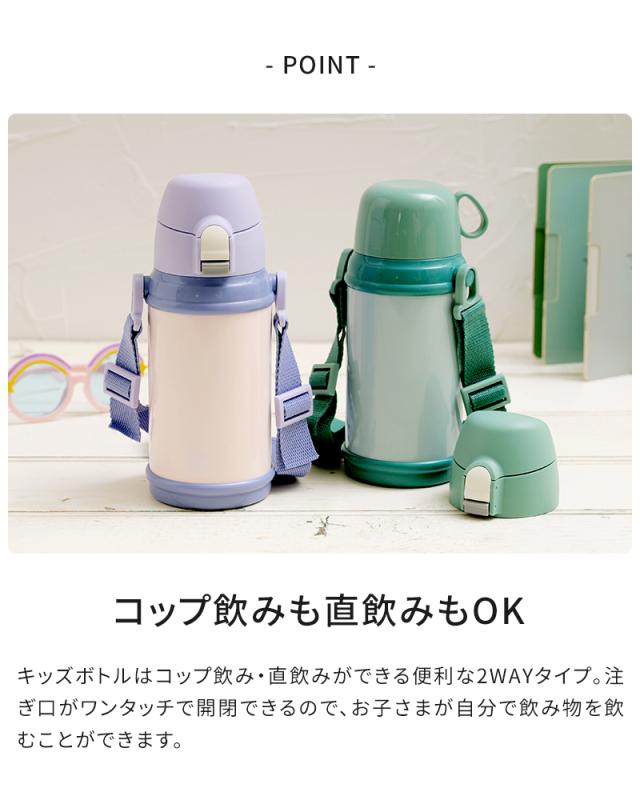 キッズボトルはコップ飲み・直飲みができる便利な2WAYタイプ。ステンレスボトルなので保冷・保温機能もばっちりです。注ぎ口はワンタッチで開閉でき、お子さまでも自分で簡単に飲むことができます。肩から下げられるストラップ付きで、ピクニックや遠足、街歩きにも。お気に入りの水筒を持って、一緒におでかけしましょ♪