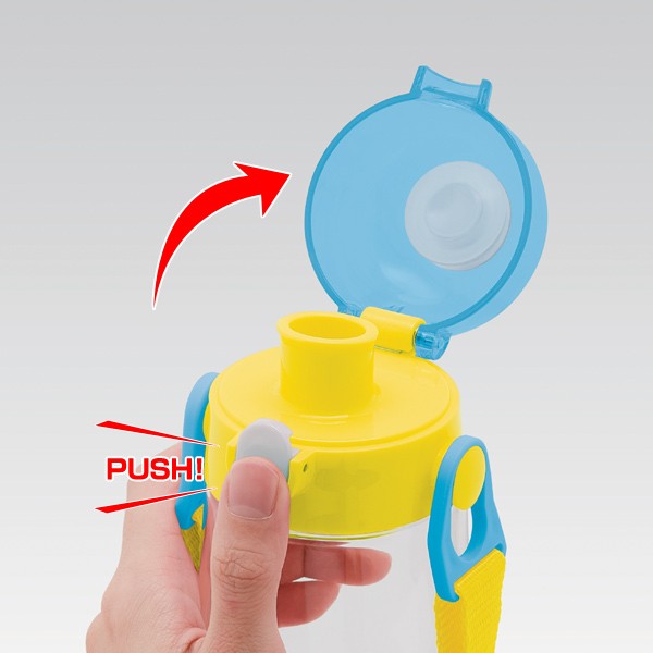 水筒のフタはボタンを押すだけで開けることができるワンタッチ式です。小さなお子様でも簡単に開けられます。