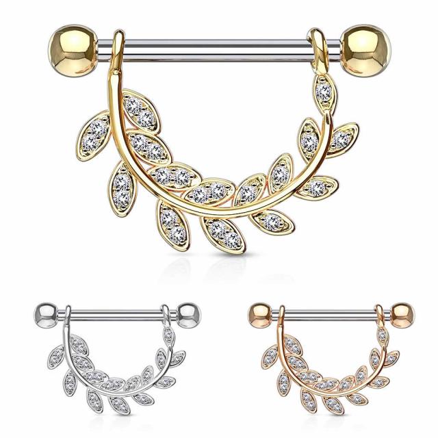 [ 14G ニップル ヘリックス ボディピアス ] クリスタルパヴェリーフ ストレートバーベル ピンクゴールド イエローゴールド シルバー シールド 14ゲージ 軟骨 乳首 胸 耳 乳輪 メンズ レディース サージカルステンレス316L ボディーピアス ジルコニア 葉 リーフ