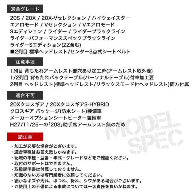 | 注意事項 | 1列目 背もたれアームレスト部穴あけ加工済(アームレスト取外要)1/2列目 背もたれバックテーブル(パーソナルテーブル)付車加工要2列目 ヘッドレスト(標準ヘッドレスト/リラックスモード付ヘッドレスト)両方付属 |