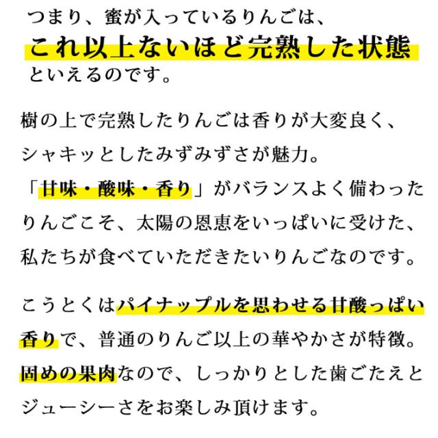 - 届いたりんごは、とても新鮮で爽やかな香りとシャキッとした歯応えがあり、どれも蜜がたっぷり入っていました。 普段の食べているりんごとは違う豊かな風味でとても美味しかったです。また注文したいと思います。
