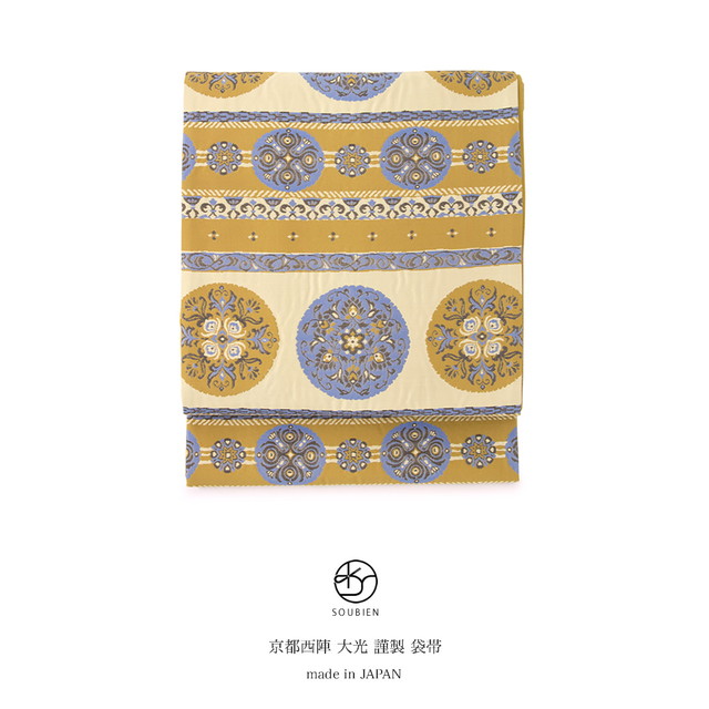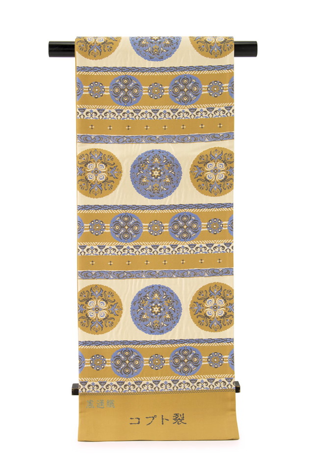 【未仕立て】袋帯 黄土色 オークル 薄茶色 ベージュ 青系 丸間道 唐花 コプト裂 風通織 正絹 大光謹製 京都西陣織 2362 六通柄 カジュアル 日本製