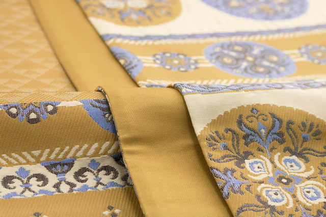 丸間道に豪華な雪輪のような唐花が配されたのモダンなデザインが風通織で織り込まれています。