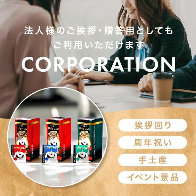 | Q. 法人での注文は可能ですか? A. はい、法人様からのご注文も承っております。挨拶回りや贈答用、イベント景品など幅広くご利用いただけます。 Q. のし・ギフト対応はできますか? 商品によって対応可能です。詳細は商品ページ内の案内、または事前にお問い合わせください。 Q. 個包装になっていますか? 1杯分ずつ「個包装」のドリップコーヒーのため、配布用にも適しています。 Q. 挨拶回り・周年祝いに使えますか? 会社のご挨拶、周年祝い、手土産、来客用として多くの企業様に選ばれています。 |