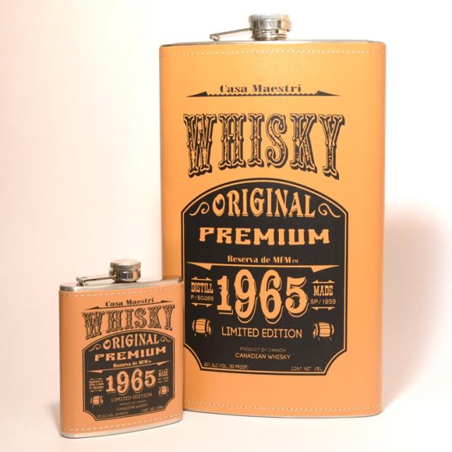 スキットルともいわれる、高アルコール度数の蒸留酒を入れるための水筒「フラスクボトル」に、4〜5年熟成のカナディアンウイスキーを詰め込んだ商品。