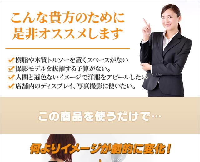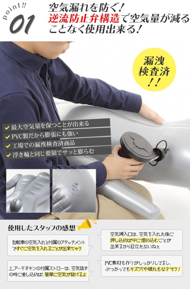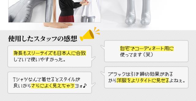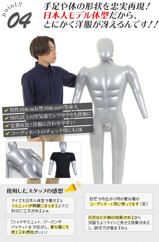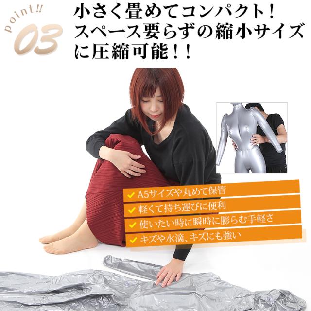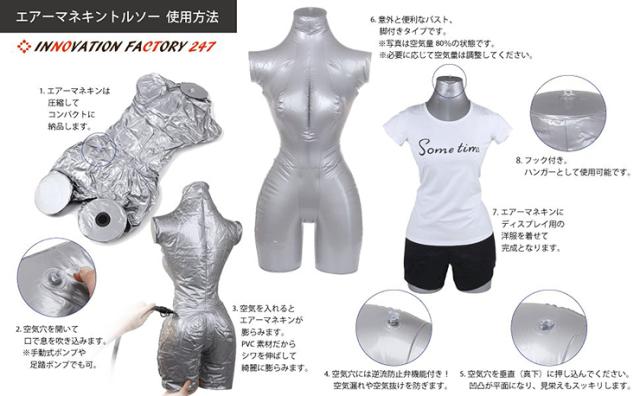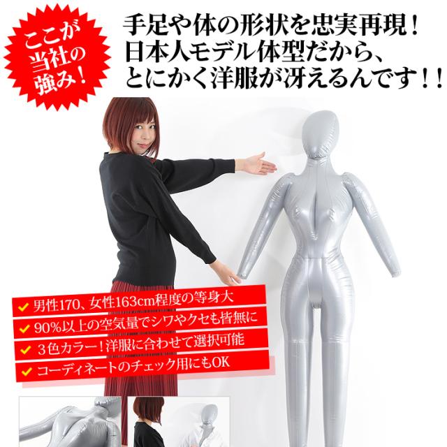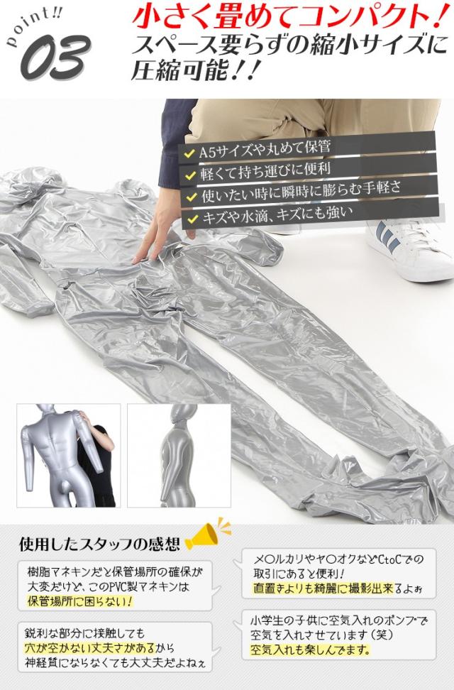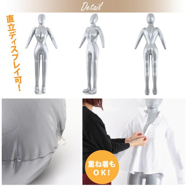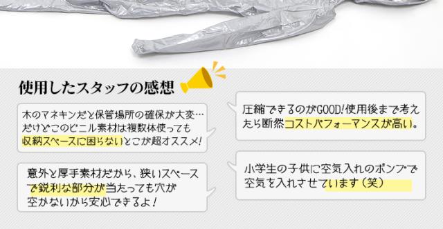使用事例:アパレル店様から木製トルソーより簡易的で使い易いディスプレイ業務用として爆発的なニーズがあるエアーマネキンです。東京を中心に路面店のブテック、セレクトショップ様からも多数のオファーがございます。個人出品者としてフリーマーケットのディスプレイ用や各種撮影にも高い利便性がございます。お店内の棚上などのちょっとした空間に。縫製の出来ばえチェックや、お気に入りの衣装の保管などに。お好みに合わせて、自由自在にお使いいただけるビニールマネキン最高峰です。
