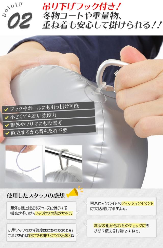 機能:素早く、簡単に展示することができます。お手軽に、魅惑のディスプレイを演出できるので、売上アップにつながります。空気を入れて膨らませるだけですので、どなたにも簡単にお使いいただけます。軽量で、かつコンパクトに収納することができるので持ち運びにも便利です。