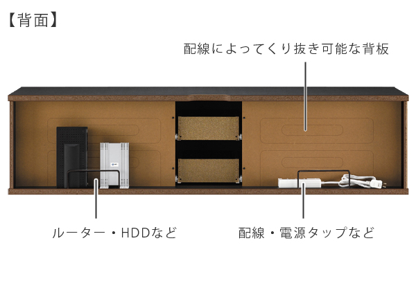 ●引き出しが2ヵ所、ガラス扉、更に背面収納付きで収納力は抜群です。