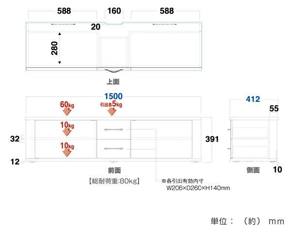 天板:60kg、棚板:10kg、引き出し:5kg