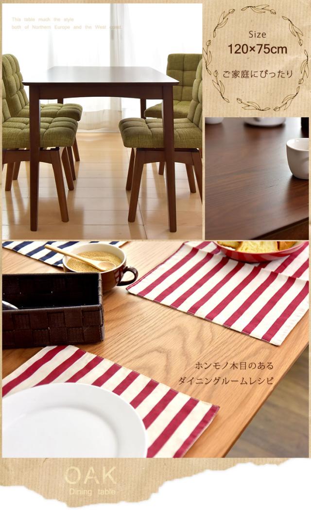 | サイズ | 幅120×奥行75×高さ71cm | 【スタッフひーちゃんのおすすめポイント!】 ・まっすぐ伸びた木目が美しいオーク材の突き板を使用したダイニングテーブル |