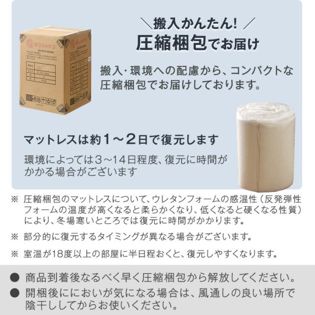 ※圧縮梱包のマットレスについて、ウレタンフォームの感温性(反発弾性フォームは温度が高くなると柔らかくなり、低くなると硬さが高くなる性質)により冬場、寒いところで復元させると、復元に時間がかかります。又、部分的に復元するタイミングが異なる場合がございます。室温が18度以上の部屋に半日くらいおくと、回復がしやすくなります。