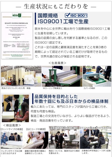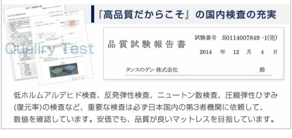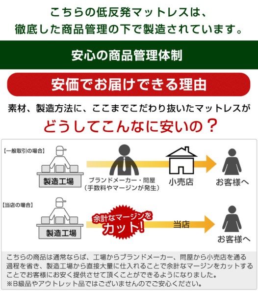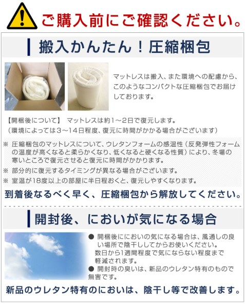 ※圧縮梱包のマットレスについて、ウレタンフォームの感温性(反発弾性フォームは温度が高くなると柔らかくなり、低くなると硬さが高くなる性質)により冬場、寒いところで復元させると、復元に時間がかかります。又、部分的に復元するタイミングが異なる場合がございます。室温が18度以上の部屋に半日くらいおくと、回復がしやすくなります。