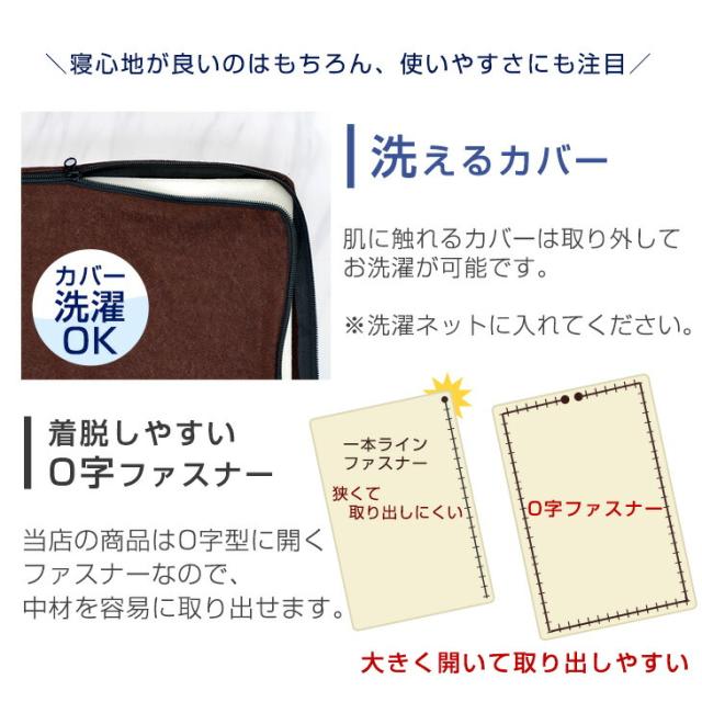 | 備考 | 【カバー洗濯可】 ※配送は全て宅配便(1人)での玄関渡しとなります。 ※マットレスは約1~2日で復元します。気温や温度により3~14日かかる場合もあります。 ※圧縮梱包のマットレスについて、ウレタンウォームの感温性(反発弾性フォームは温度が高くなると柔らかくなり、低くなると硬さが高くなる性質)により冬場、寒いところで復元させると、復元に時間がかかり、又、完全に復元しない場合がありますので室温が18度以上の部屋に半日くらいおくと、回復がしやすくなります。 ※開封時の臭いは新品のウレタン特有のもので無害です。 ※2018年6月27日より品質表示法の改正に伴い、ニュートン数を180Nから220Nへ変更しました。表示の数値が変わるだけで製品自体の品質・性能に変更はありません。 ※2018年11月15日に、ニュートン数を220Nから230Nに、ファスナーの形状をL字からO字に変更しました。※2025年5月8日より三つ折りタイプの販売を開始しました。 | |