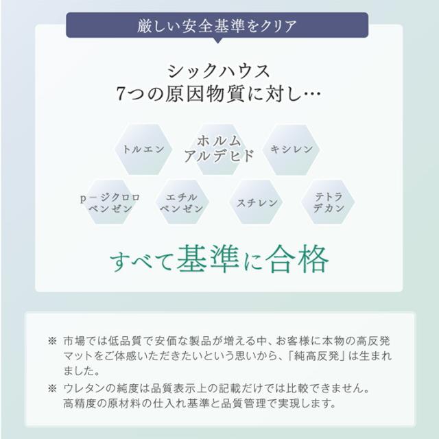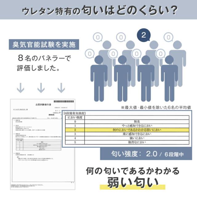 | 素材 | 側生地:シンカーパイル(ポリエステル100%) 中材:高反発ウレタンフォーム(密度30D<30kg/m3>、230N) | |