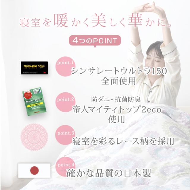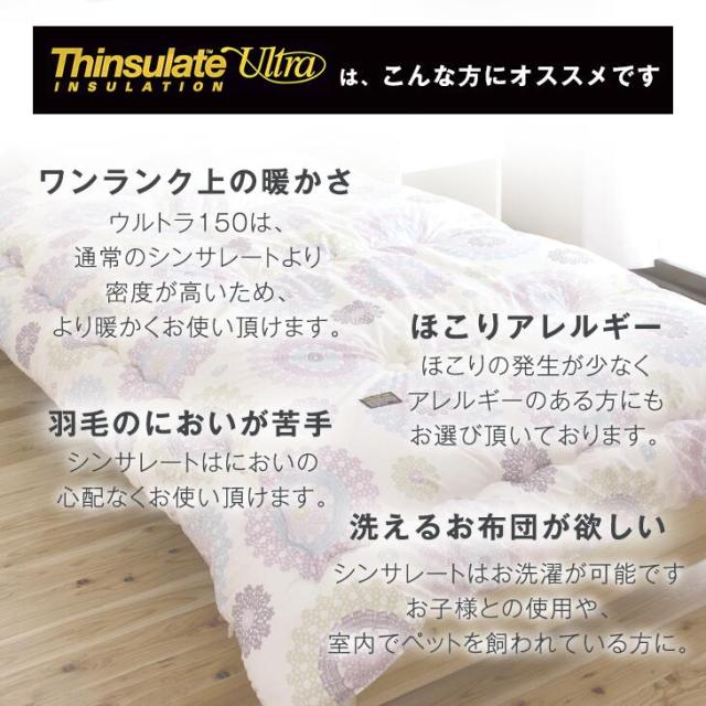 - 冬はもうずっとシンサレートのお布団を使っています。 我が家は犬を飼っているので、犬の毛の絡まりやすい毛布も必要ないのでとても良いです。 布団の表面がサラサラ、ツルツルしているので、ペットの毛がつきにく...