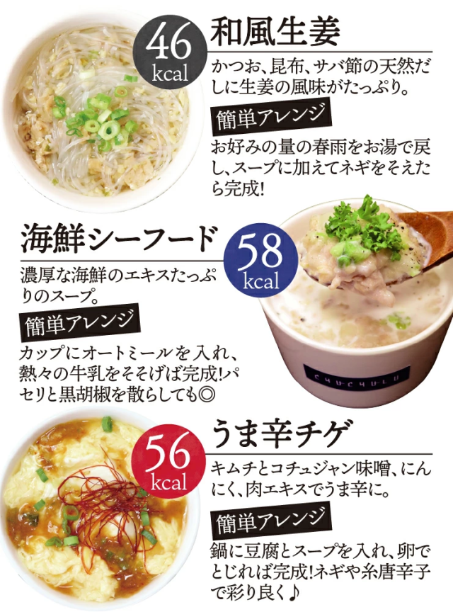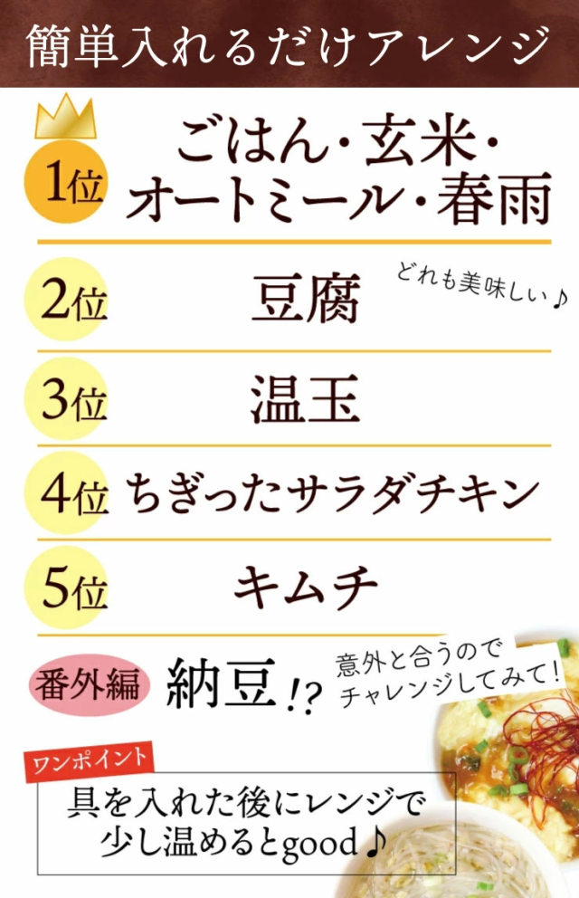 - 豆腐、春雨、ご飯など入れて6食も味変えるので飽きないです。昼の弁当替わりに食べてます。