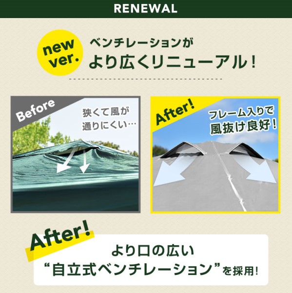 ※タープの耐水加工は雨天・豪雨でのご使用を保障するものではありません。悪天候時の使用はお控えください。また頂点部にベンチレーションを持ち、側面がオープンとなっているタープの構造上、完全に雨が防げないことを理由とした返品交換はお受付できません。予めご了承ください。
