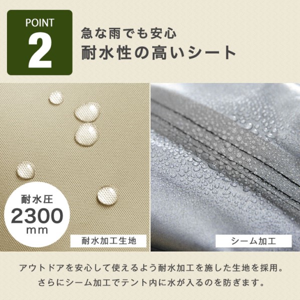 ※耐水加工を施しておりますが、荒天時にはペグで地面に固定してもテントが破損する場合がございます。風・雨などの自然現象による破損につきましては保証できかねますので予めご了承ください。
