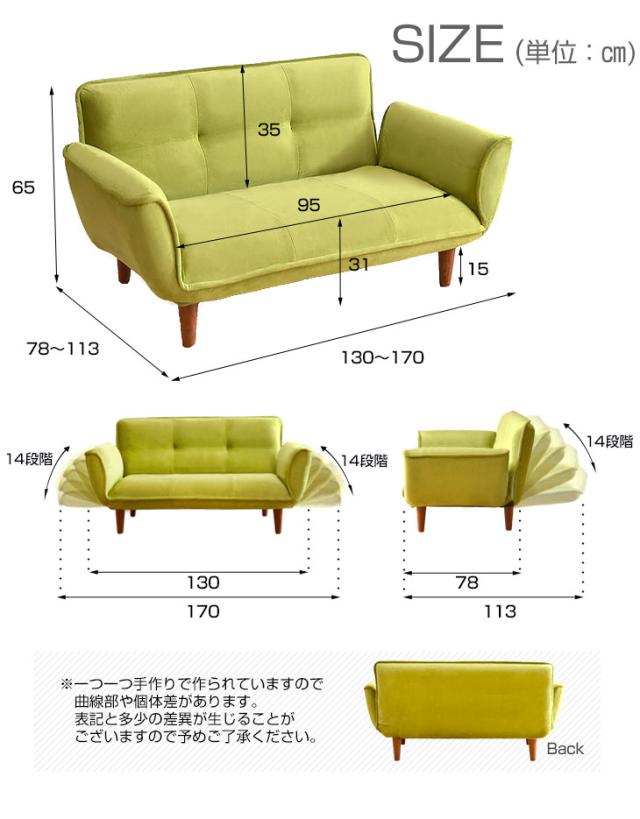 | サイズ | 幅:130〜170cm 奥行き:78〜113cm 座面高さ:31cm(脚15cm含む) 背もたれ:幅95cm×高さ35cm 脚:15cm 座面:幅95cm×奥行55cm 背もたれ(床からの高さ):31〜65cm(脚15cm含む) | 【スタッフひーちゃんのおすすめポイント!】 ・安心と信頼の品質 日本製 ・ポケットコイル使用でワンランク上の座り心地 ・ウレタンをへたりにくくするモールド成型採用 ・背もたれ、肘掛けは14段階リクライニングが可能! ・脚は、床を傷つけない傷防止フェルト付き ・脚を外してロータイプでも使える2WAY! ・テクノ、ダブルラッセル、PVC、ダリアン生地から選べる4生地19カラー ・すぐに使える完成品 |