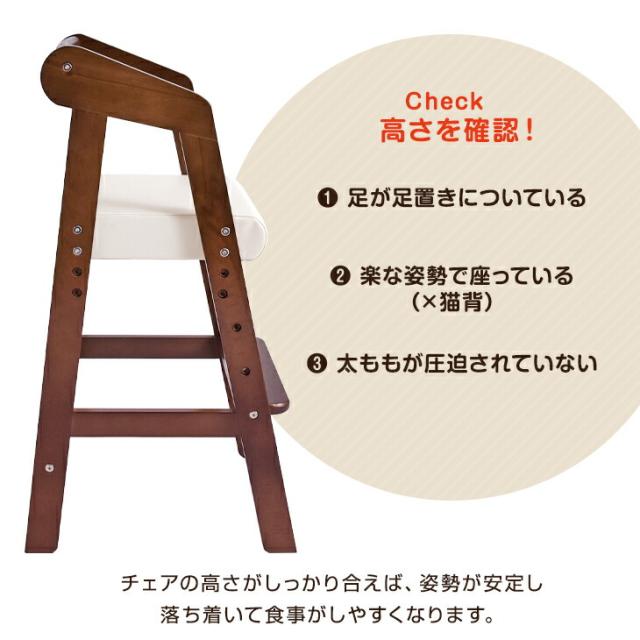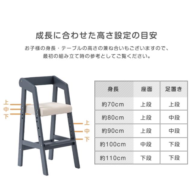 - ダイニングチェアとして購入しました。 今身長110?ほどですが、座面一番上足置き一番下でちょうど良さそうで、座った感じも食べやすい高さになりました。安定感もあり、色味もいい感じにテーブルや部屋と馴染み...