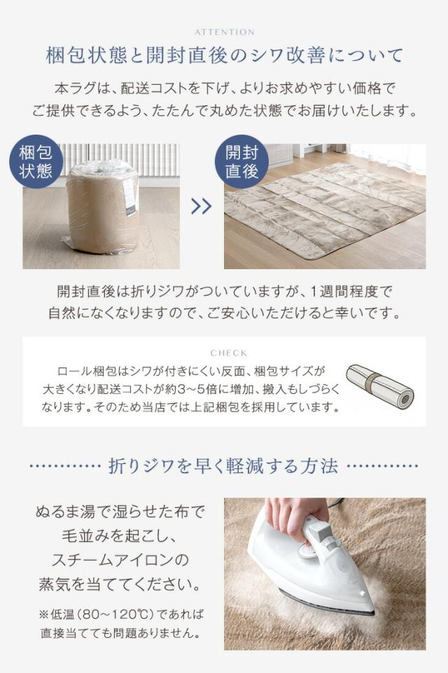 ※開梱直後はラグに折り目がついている場合がございます。 1週間程度で自然になくなりますので、そのまま 床に敷いてお使いください。