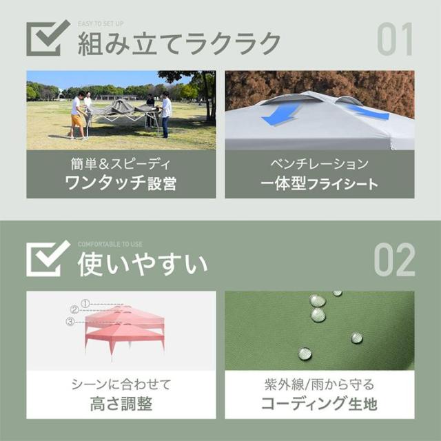 タープテント 3m 1年保証 ワンタッチ タープ ベンチレーション 収納バッグ UV 耐水 高さ3段階 テント ワンタッチタープ ワンタッチタープ テント ワンタッチテント 大型 3m×3m バーベキュー キャンプ アウトドア レジャー おしゃれ