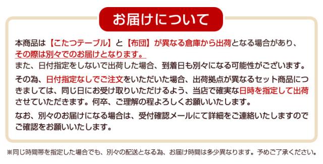 ※誠に恐れ入りますが、本商品は【こたつテーブル】と【布団】が別々のお届けとなります。ご迷惑をおかけしますが、何卒ご理解のほどよろしくお願いいたします。