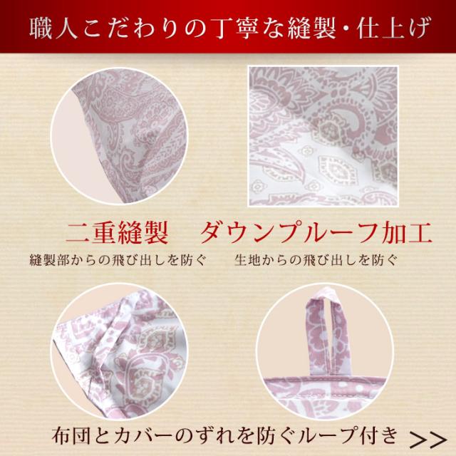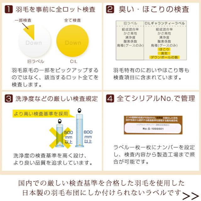 ※羽毛は天然素材のため、無臭ではございません。原毛は洗浄によりほとんど臭いを感じないようにはしておりますが、開梱直後や温度・湿度等の環境等により臭いを感じる場合がございますので、開封直後には風通しの良い場所での十分な陰干し等をお勧めいたします。なお、天然羽毛の臭いのため人体に害はございませんのでご安心ください。