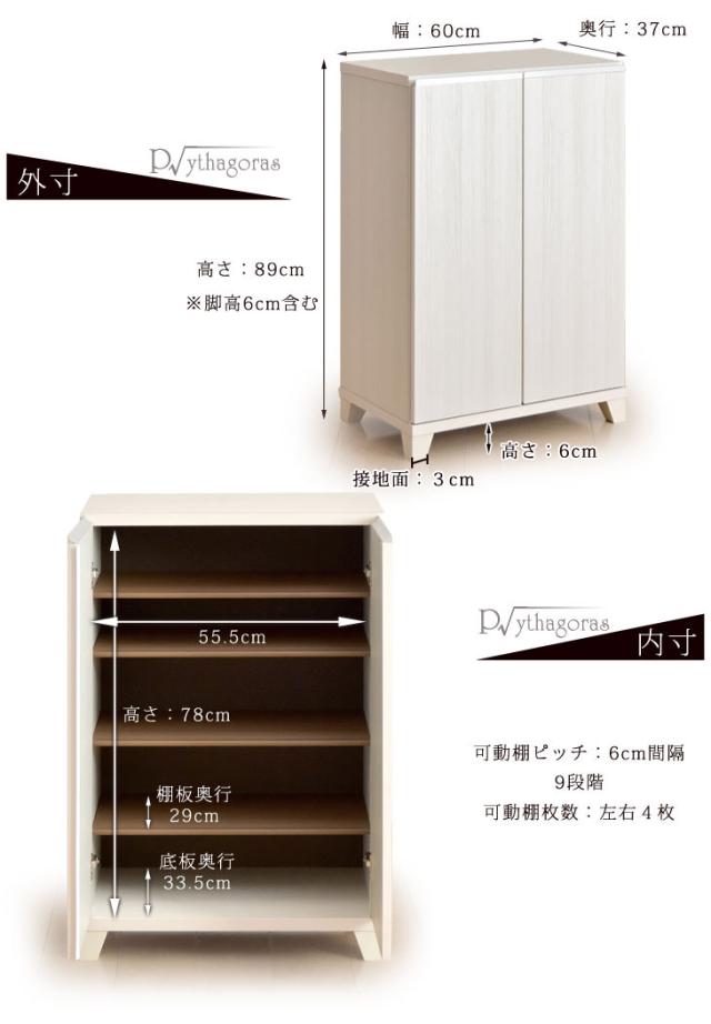 | サイズ | 【外寸】幅60x奥行37x高さ89cm 【内寸】幅55.5x奥行33.5x高さ78cm 【天板/下板厚み】2.5cm 【可動棚ピッチ】6cm間隔(枚数:4枚) | 【スタッフみどぅのおすすめポイント!】 ・家具の街、大川の職人による日本製 ・完成品でお届け ・美しい木目と引っかかりの無いアルミ塗装仕上げの取手が調和したデザイン ・背面は靴の臭いを防ぐ脱臭機能コーティング ・砂や泥を簡単に落とせる洗える棚板 ・大きめの靴も入る奥行き33.5cm |
