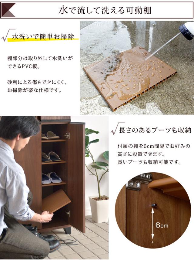 | サイズ | 【外寸】幅90x奥行37x高さ151cm 【各天板/下板厚み】2.5cm 【可動棚ピッチ】6cm間隔 | 【スタッフしょこたんのおすすめポイント!】 ・家具の街、大川の職人による日本製 ・完成品でお届け ・美しい木目と引っかかりの無いアルミ塗装仕上げの取手が調和したデザイン ・背面は靴の臭いを防ぐ脱臭機能コーティング ・砂や泥を簡単に落とせる洗える棚板 ・大きめの靴も入る奥行き33.5cm ・上段でも出し入れしやすい高さ設計 ・自由に使えるオープンスペース付き |