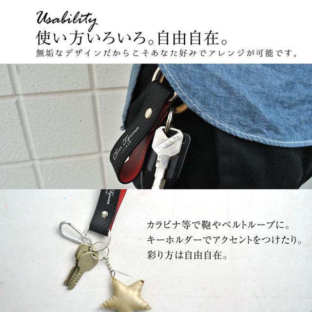 【キーリング付ベルトチャーム キーホルダー】牛革カーボンレザーの質感を手元でいつも楽しめるアイテム。鍵を留めるためのリング部分は余裕の直径32mm。軽量ながら肉厚、そしてリングに挿入しやすい構造。定番のベルトタイプキーホルダーをカーボンレザーで仕上げることで、長く使えて飽きが来ない、実用性抜群の一品。プレゼント・ギフトにも間違いないユニセックスデザイン。大人のレザーアイテムとして喜ばれることは間違いないでしょう。【カーボンレザー】 スタイリッシュでフォーマルにも対応した人気のレザー。なんといっても見た目のクールさが一番の人気の理由。シチュエーションを選ばない点と傷や水分にもある程度耐性があることからも支持を得ています。