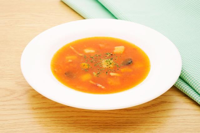 | 原材料 | 野菜(人参(国産)、じゃがいも(国産)、かぼちゃ、トマト)、ソテーオニオン(玉ねぎ、食用油脂)、 食用油脂、トマトジュース、ベーコン、トマトペースト、食塩、チキン風味調味料、砂糖、ガーリックパウダー、 香辛料/増粘剤(加工でんぷん)、調味料(アミノ酸等)、リン酸塩(Na)、着色料(コチニール、ラック)、発色剤(亜硝酸Na)、 (一部に乳成分・卵・大豆・豚肉・鶏肉・ゼラチンを含む) |