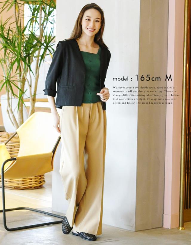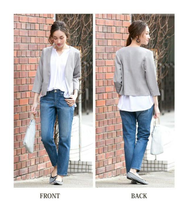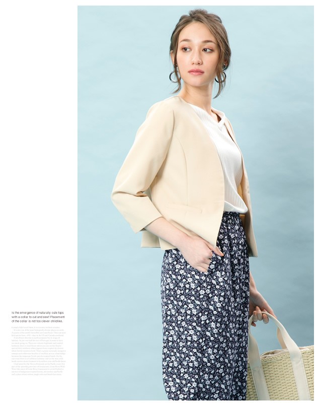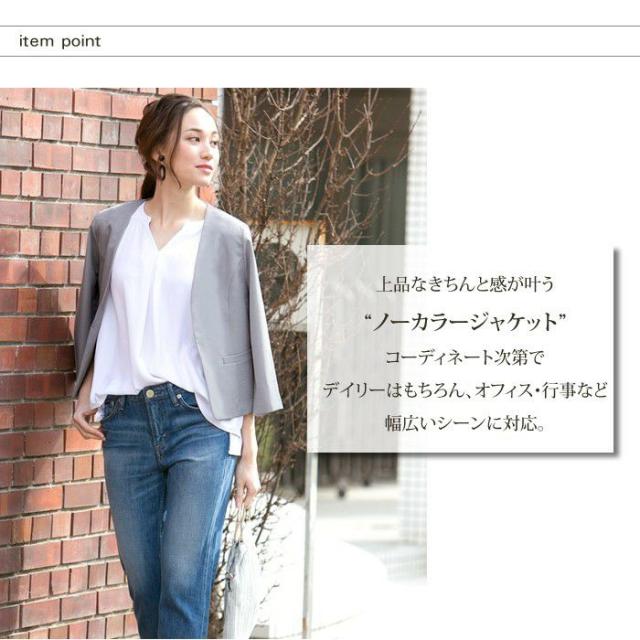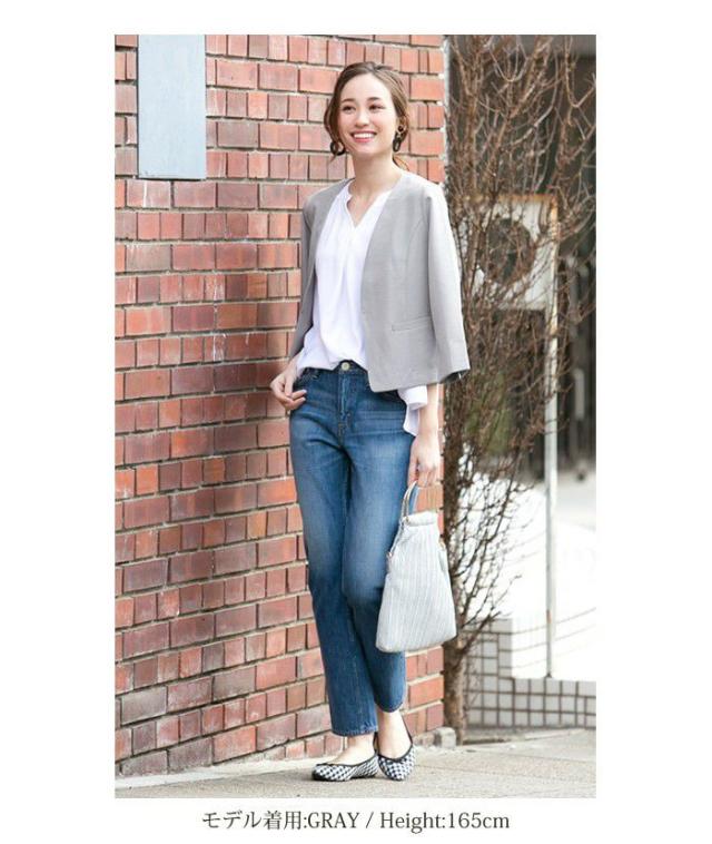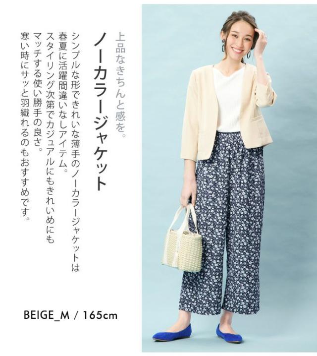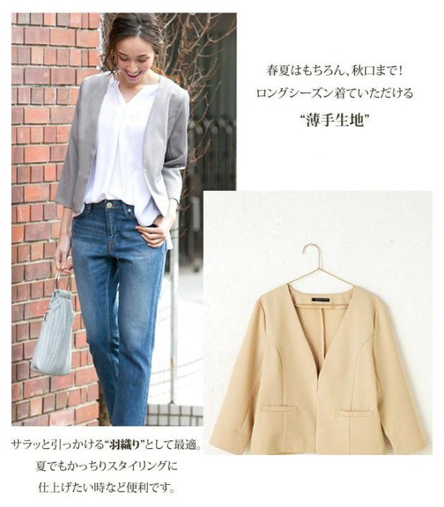 シンプルで形のきれいな薄手ノーカラージャケットは春夏に活躍するマストアイテム!