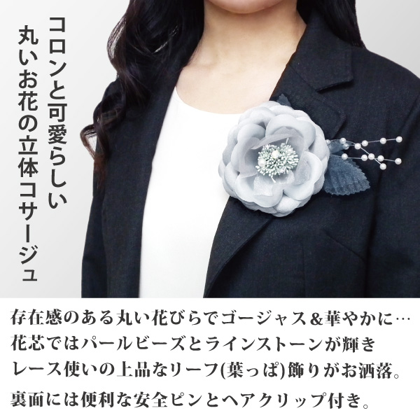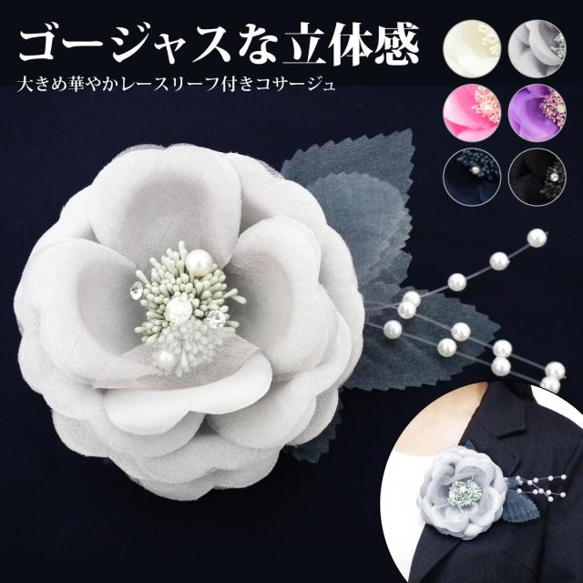 丸みのある大きめの花びらが可愛らしいコロンとした立体感のあるコサージュです。透け感が美しいレース生地のリーフ(葉っぱ)が付いたゴージャスなデザインでお洋服に華やかさをプラスしてくれます。