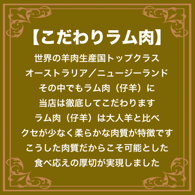 - 初めて食べました。 厚切り肉の為、少し臭みがあるのかな? と思っていましたが臭みもなく、柔らかいです。 美味しく頂きました。 もう少し食べやすく肉をカットしてあったら良いと思って(個人的感想!) 星マ...