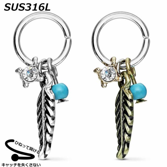 サージカルステンレス316L製のシームレスリングにアンティークシルバーとアンティークゴールドの羽根のフェザーチャームとターコイズブルーの天然石風トルコ石ビーズとクリスタルのチャームが揺れるインディアンジュエリーモチーフのキャッチのいらないシャフトをツイストさせるシームレス型ボディピアス。キャッチをなくす心配のないリング型ボディーピアスは鼻ピアスのセプタムや耳の軟骨ヘリックスやトラガス、コンクなどいろいろな場所へのピアッシングに最適。ひねるようにツイストさせるので装着も比較的簡単。女性の方は工具など使用してもいいかも。メンズでもレディースでも使えるおしゃれなボディピアス。プレゼントやペアルックにも最適です。お返しのギフトにもぴったり。リングの太さは18ゲージ(18G)、16ゲージ(16G)から選んでいただけます。【スペック】