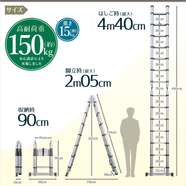 はしご 4.4m 伸縮 脚立 梯子 アルミ 製 折りたたみ 保証付き 安全ロック 搭載 アルミ製 440cm ハシゴ 梯子 軽量 スーパーラダー