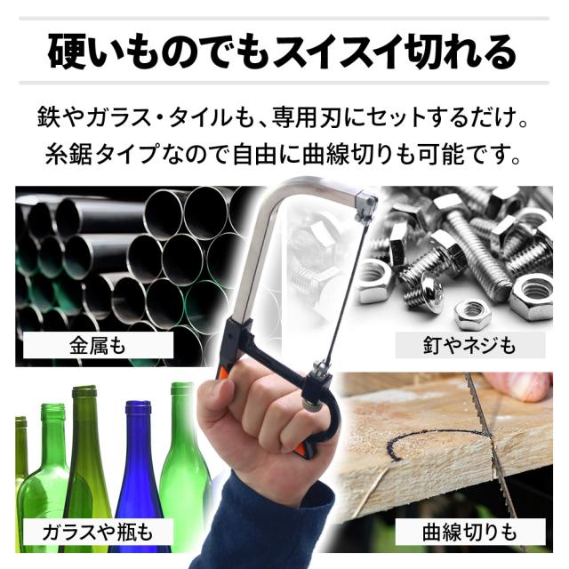 | 万能のこぎり どんな曲線も簡単に、硬いものがスイスイ切れる! 鉄やガラス、タイルも専用刃にセットするだけで 簡単に切ることができるノコギリであり、糸鋸タイプですので自由に曲線切も可能な優れものです。 地震や突然の非常時に、はさまったものを取り出したい時とか、 倒れてきたものが邪魔になって必要なものが取り出せない時などに効力を発揮し、 コンパクトサイズですので、非常袋にも入り普段は邪魔になりません。 日常生活の様々な場面で活躍 日曜大工、ガーデニング、お子様の工作など様々な用途に幅広くお使いいただけます。 粗大ゴミの解体にもお役立ち 自分で粗大ゴミを解体すれば普通ゴミとして出せて、 粗大ゴミ代が節約できます。 ■平ノコ刃 木材、塩化ビニル、段ボール、ベニヤ板等の切断に向いている刃です。植木の剪定などにも使えます。 ■糸ノコ プラスチック、ゴム、竹、ひも、軟鉄、アクリル、くぎ、ボルト等の切断など幅広い用途にお使いいただけます。 ■タングステンローラー ガラス、タイルなどにスジ(引っかき傷)を付けて思い通りに割りやすくします。 敷居の高く感じるガラスのカットも家庭で簡単にできます。 【商品詳細】 サイズ(約):25×10.2×2cm 重量(約):250g 本体材質:ステンレス、スチール セット内容:本体×1、糸鋸替刃×5、ストレート刃×1 【注意事項】 強化加工された金属やガラス等、対象によっては切れにくい場合がございます。 ゴミの処理方法や分別は、各自治体の規則にしたがってください。 |