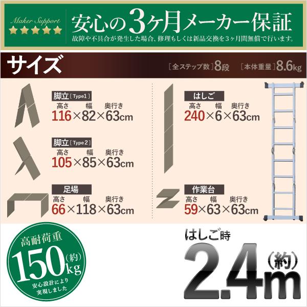 アルミ多機能はしご 最大2m40cm 保証付き アルミ脚立