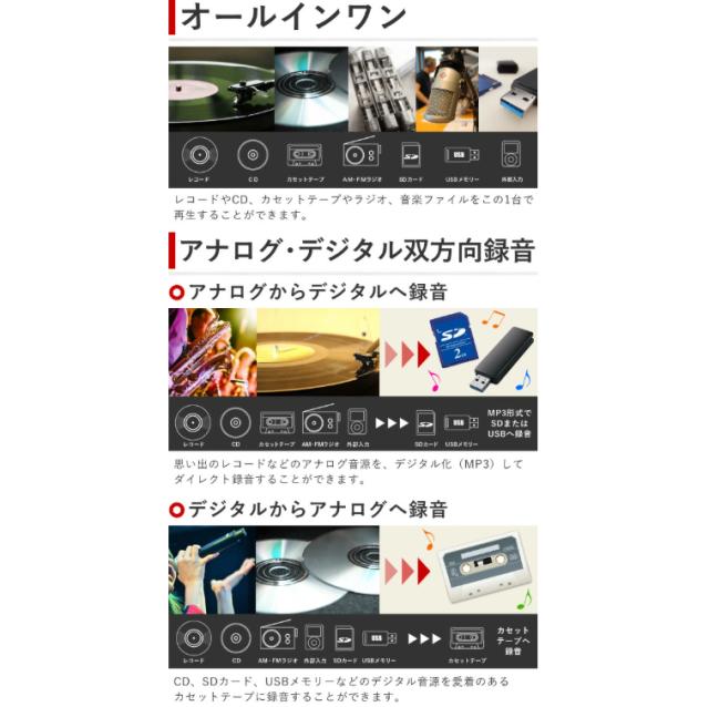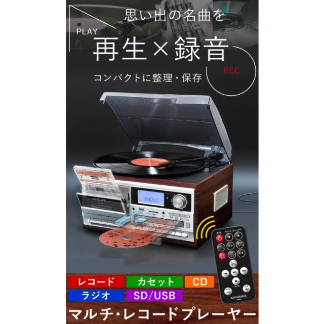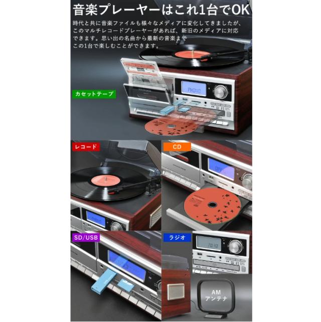 マルチレコードプレーヤー レコード、カセット、ラジオ、音楽ファイルを全て楽しめる欲張りな1台。 お気に入りのレコードやCD音源を気軽にカセットテープに録音できます。 デジタルからアナログへ保存 デジタル(USB、SD)音源をアナログ(カセットテープ)で録音可能。 愛用のカセットへ録音し、気軽に楽しむことができます。 アナログからデジタルへ保存 思い出のレコードやカセットテープなどのアナログ音源を、 デジタル化(MP3)してダイレクト録音することができます。 操作しやすい前面カセット挿入口 カセット挿入口が前面にあることで、これまでよりもスムーズに操作が可能です。 オールインワン レコードやCD、カセットテープやラジオ、音楽ファイルをこの1台で再生することができます。 さらにSDカード/USBメモリーに対応しているので面倒な配線や接続はいりません。 多機能搭載でコンパクト マルチ機能を備えていながらも設置場所に困らないコンパクトな設計です。 付属のリモコンを使用すれば離れた場所からでも簡単に操作できます。 お気に入りの曲を目覚ましに 設定した時刻にCDやラジオ、音楽データをアラームとして設定することができます。 なめらかな木目で高級感と重厚感! 本体は設置場所に困らないスピーカー内蔵のコンパクト設計です。 雰囲気のあるクラシカルな木目調デザインなのでインテリアとしてもオススメです。 レコード回転数は33/45/78回転の3段階選択ができる EP/LP盤再生に対応し、穴の大きなシングル盤用アダプタも付属しています。 ![]() ![]() ![]() ![]() ![]() ![]() 【商品詳細】 サイズ(約):(W)32X(D)29X(H)21cm 本体重量(約):3kg コード長さ(約):1.5m 再生可能メディア:レコード、カセットテープ、CD、CD-R/RW、USBメモリ、SD/MMCカード 録音可能メディア:USBメモリ、SD/MMCカード、カセットテープ 再生可能ファイル:MP3、WMA 録音形式:MP3(USBメモリ/SD/MMCカード)、アナログ(カセットテープ) 録音速度:1倍速 SD/MMC カード対応容量:最大8GB USBメモリ対応容量:最大32GB インターフェイス:USBポート、SD/MMC カードスロット 電源:AC100V・50/60Hz・DC12V・1.0A 消費電力:17W