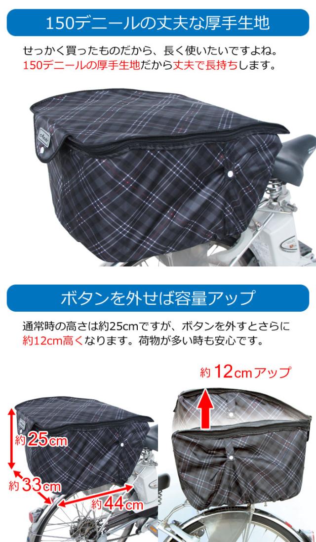 - 電動アシスト自転車でも後ろかごカバーサイズがちょうど良かった。チャックもスムーズでした