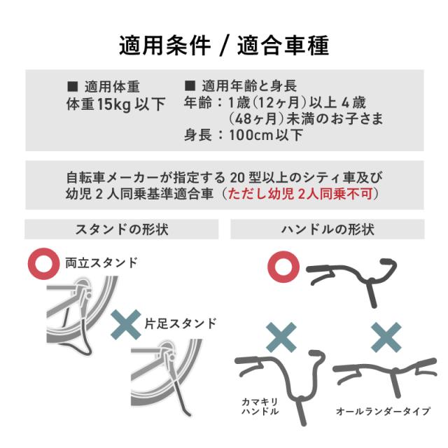自転車メーカーが指定する20型以上のシティ車及び幼児2人同乗基準適合車(ただし幼児2人同乗不可)