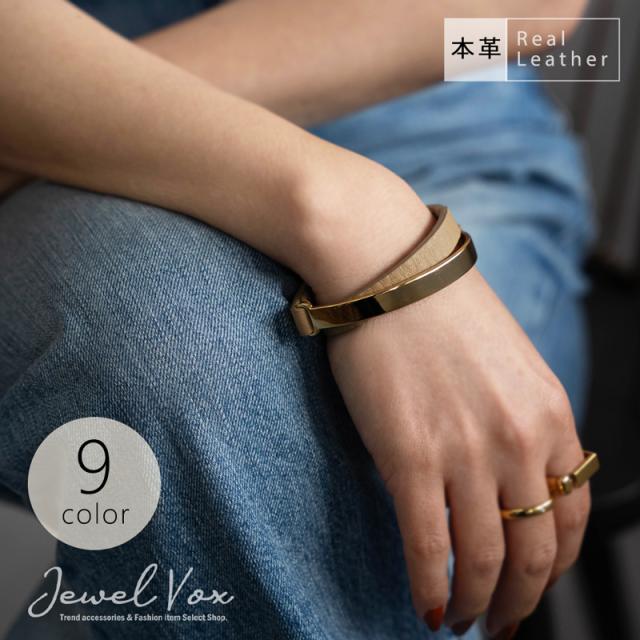 ゴールドのメタルバングルと本革レザーを合わせた2連ブレスレットです。
