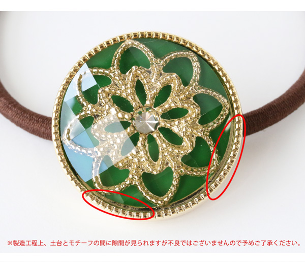 | 繊細なゴールドのお花模様が埋め込まれたとってもオシャレなヘアゴムです☆ モチーフの表面にはクリスタルカットを施したクリアのかぶせがしてあり、 光の加減でさりげないキラメキが楽しめます。 デイリー使いにぴったりな程よいサイズと上品なカラーで大人っぽい仕上がりに☆ | |