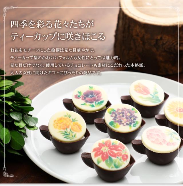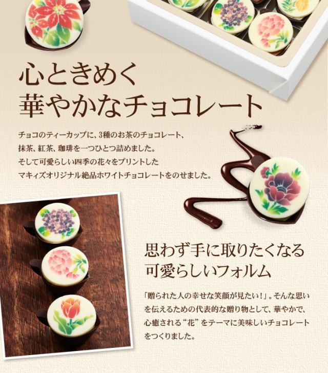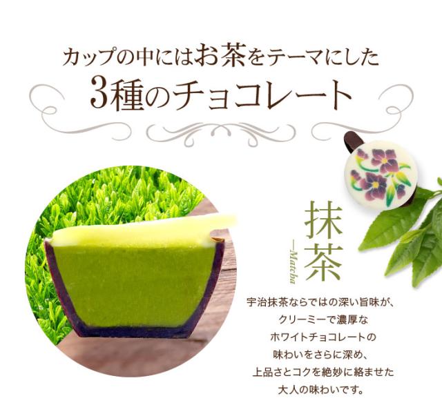 ティーカップに入った抹茶・紅茶・珈琲の味をお楽しみください。ホワイトチョコレートたっぷりティータイムに