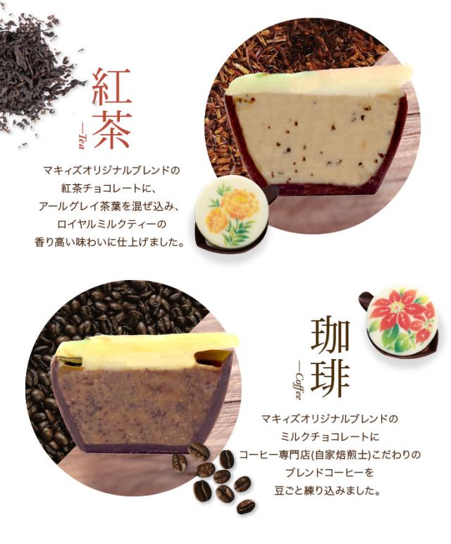 チョコレート(国内製造)、ココアバター、コーヒー、抹茶、紅茶/乳化剤、甘味料(トレハロース)、香料、着色料(カラメル、青1、黄4、赤102、赤106)、(一部に乳成分・大豆を含む)